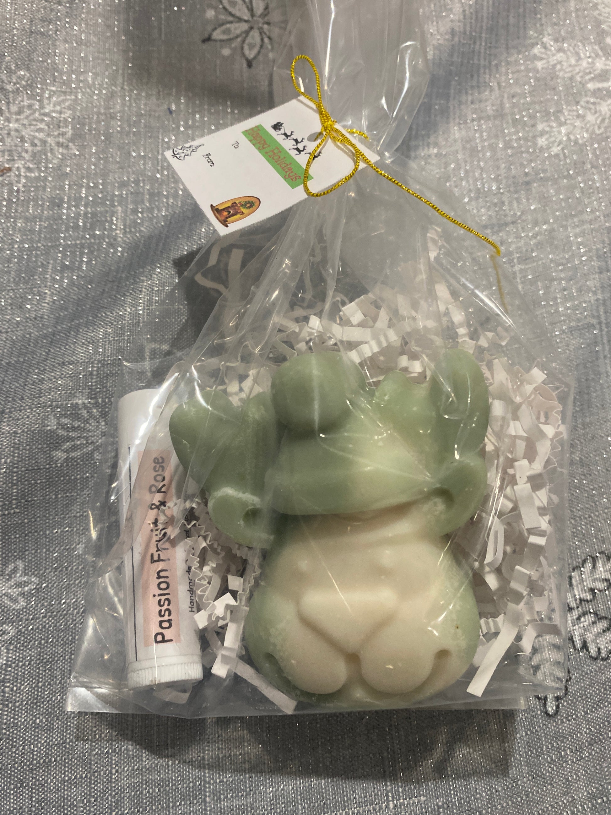 Comes in a clear gift bag with holiday tag with 4 oz soap bar, .15 oz lip balm